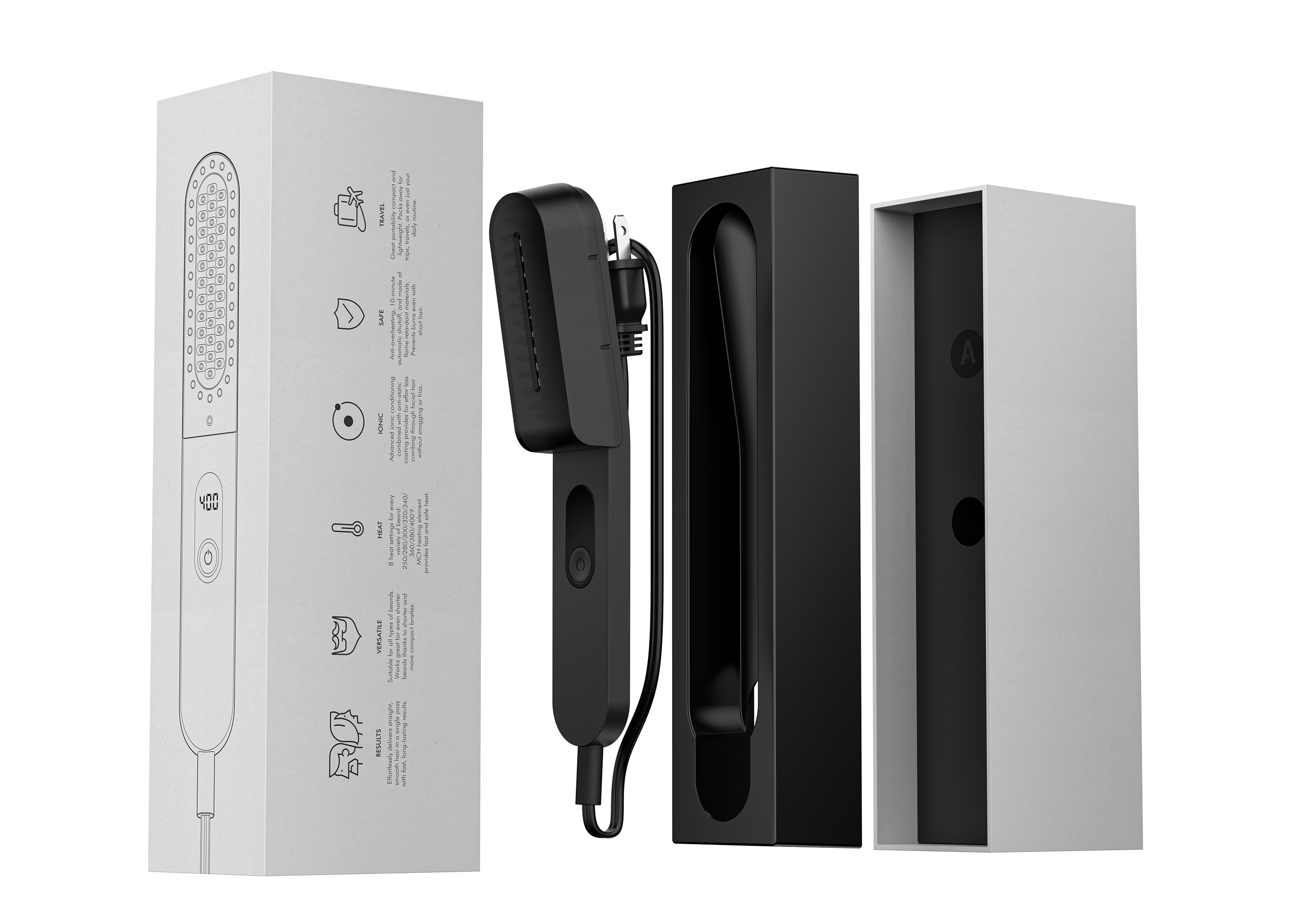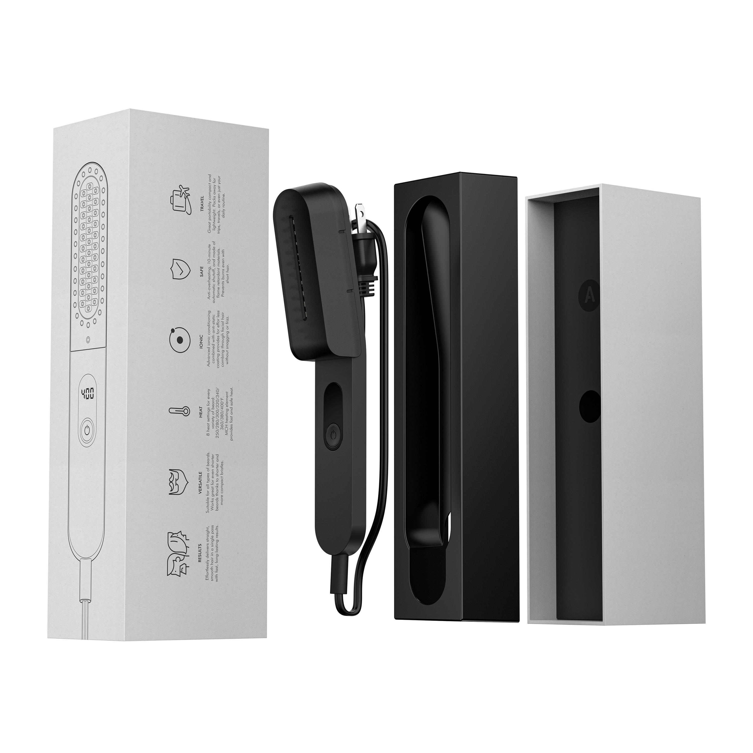 The lightest beard straightener on the market (193g) transforms unruly beards into polished styles in just 2 minutes. Features anti-scald technology for safe root-to-tip straightening, ionic conditioning to eliminate frizz, and 8 heat settings for all beard types. Heats in 60 seconds with auto shut-off for safety.