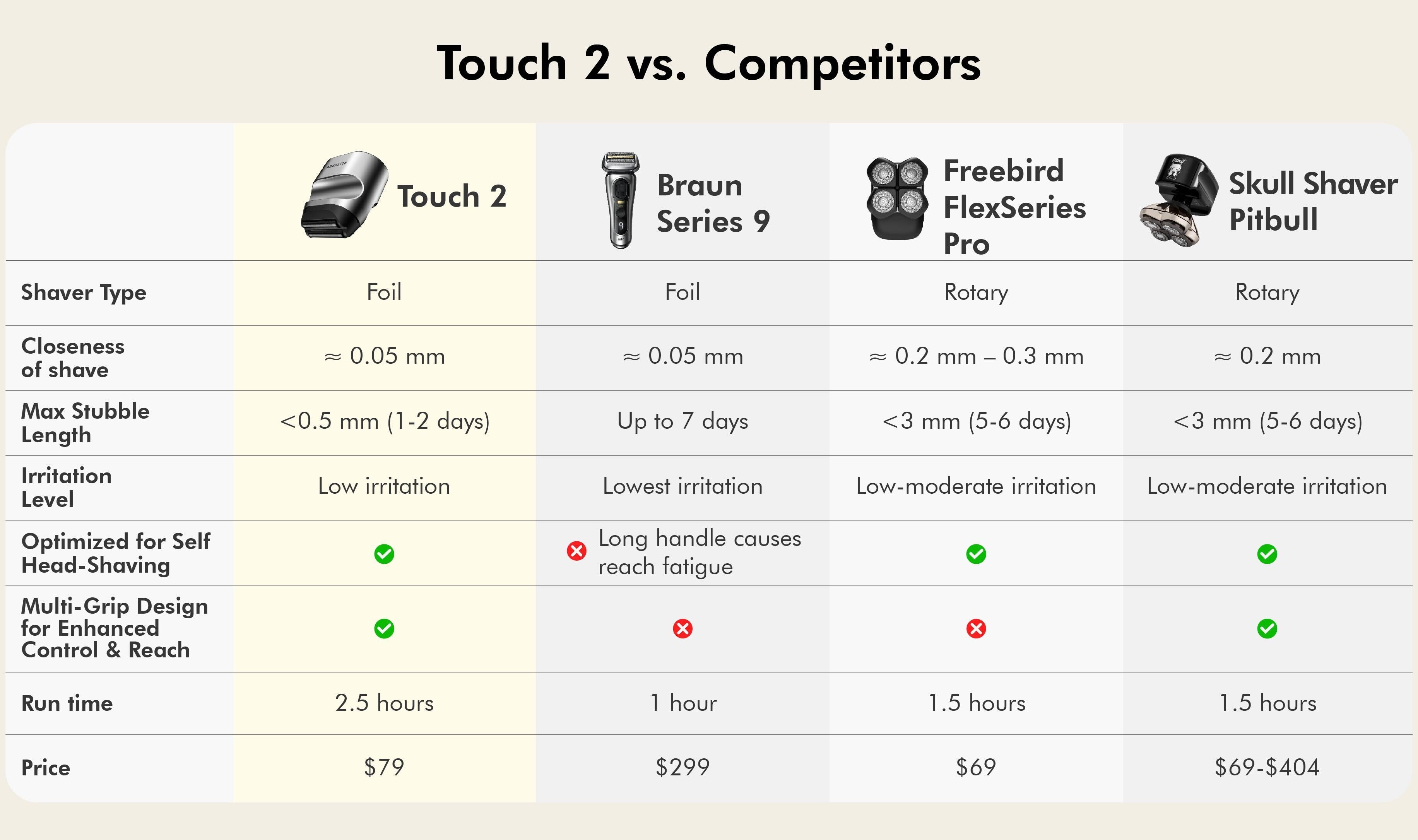 Touch 2 Finishing Head shaver is a precision foil shaver designed to deliver razor-smooth results on short stubble (1-2 days' growth, ≤0.5mm). Touch 2 works best as a finishing tool after trimming with clippers, a trimmer, or rotary shaver. Its ultra-thin 0.05mm foils and ergonomic multi-grip design provide 4-6x closer shaves than rotary shavers, with minimal irritation—perfect for achieving that barbershop-smooth finish at home. Trim gets you close. Touch 2 gets you smooth.